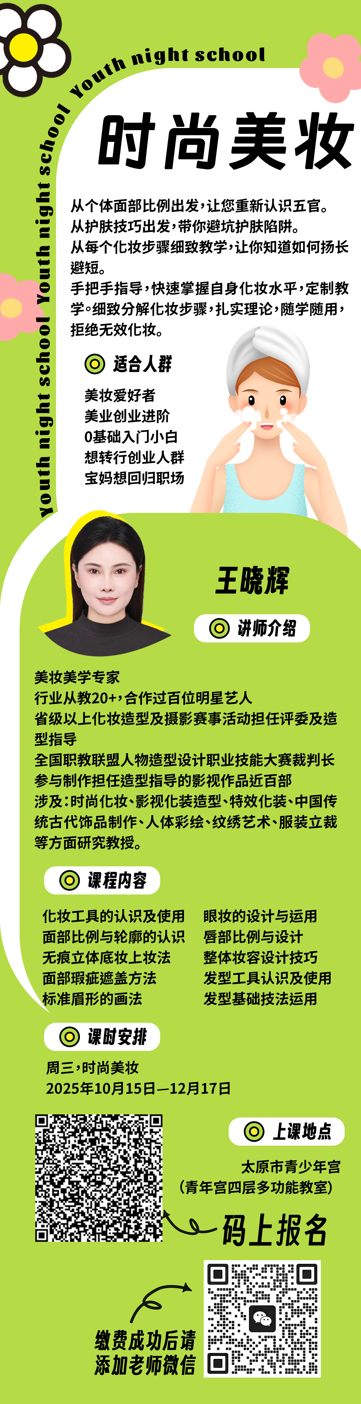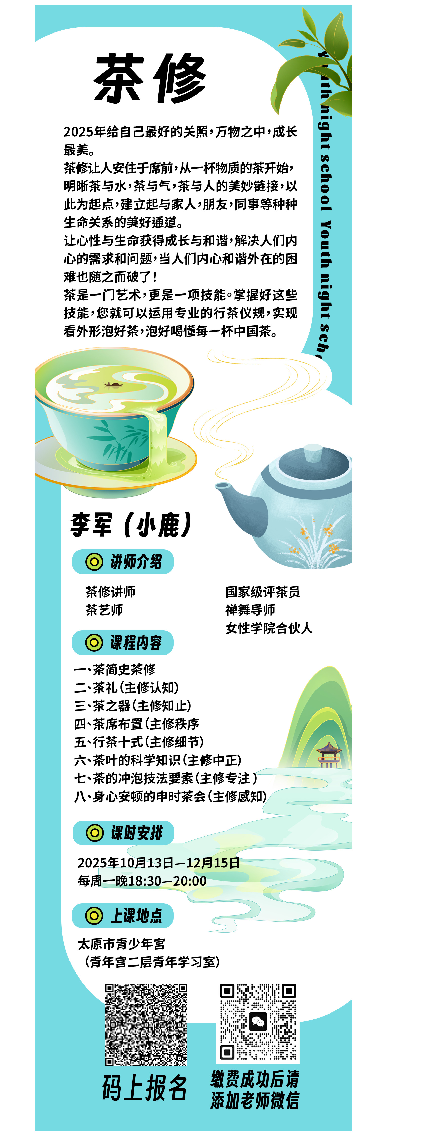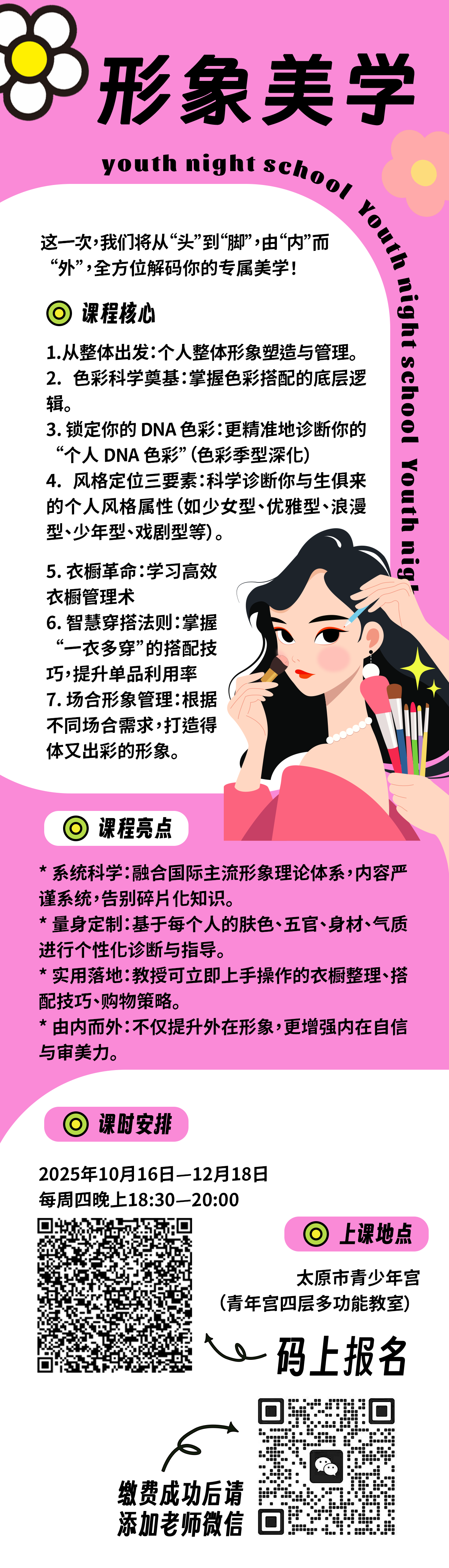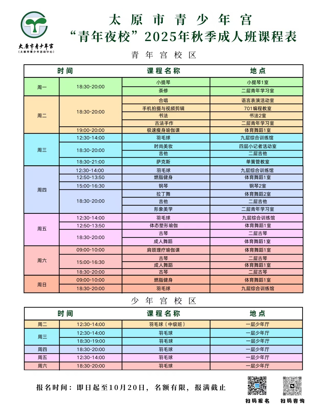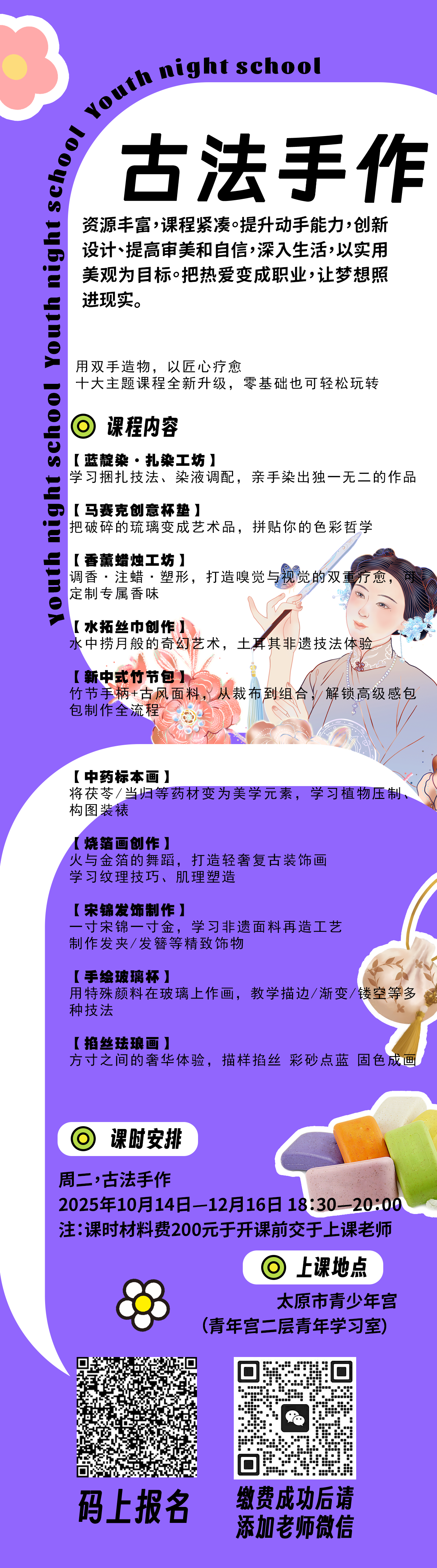 报名方式: 关注"太原市青少年宫"官方公众号,获取最新课程表和报名通道。