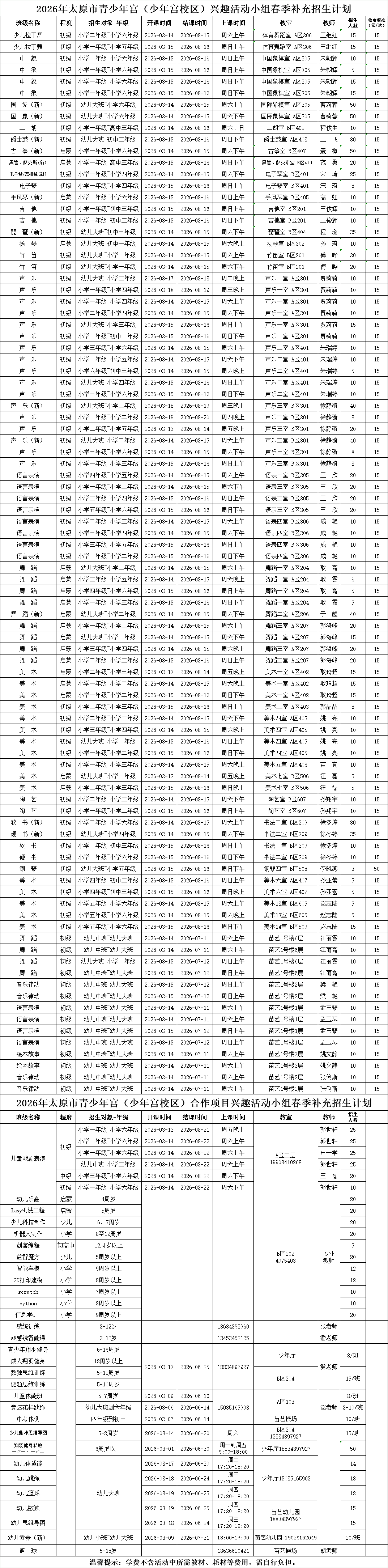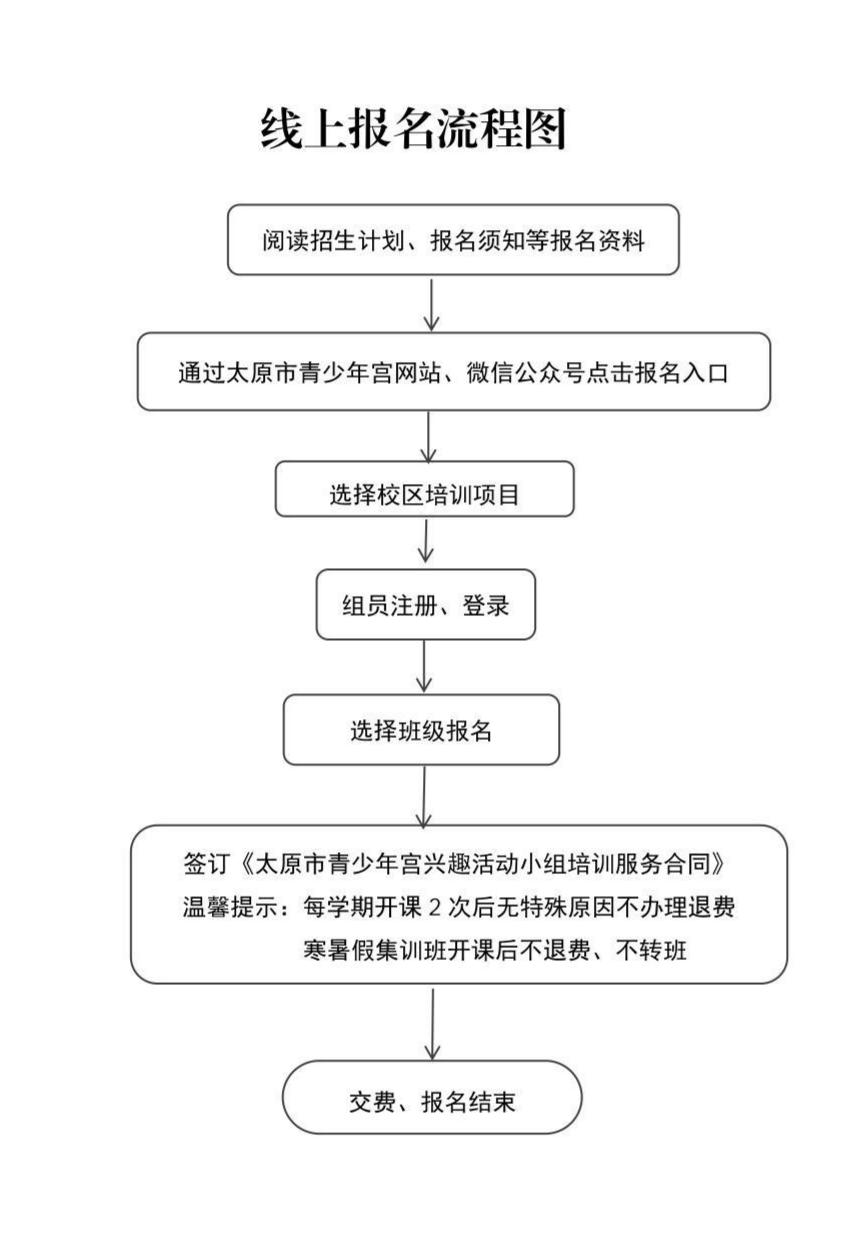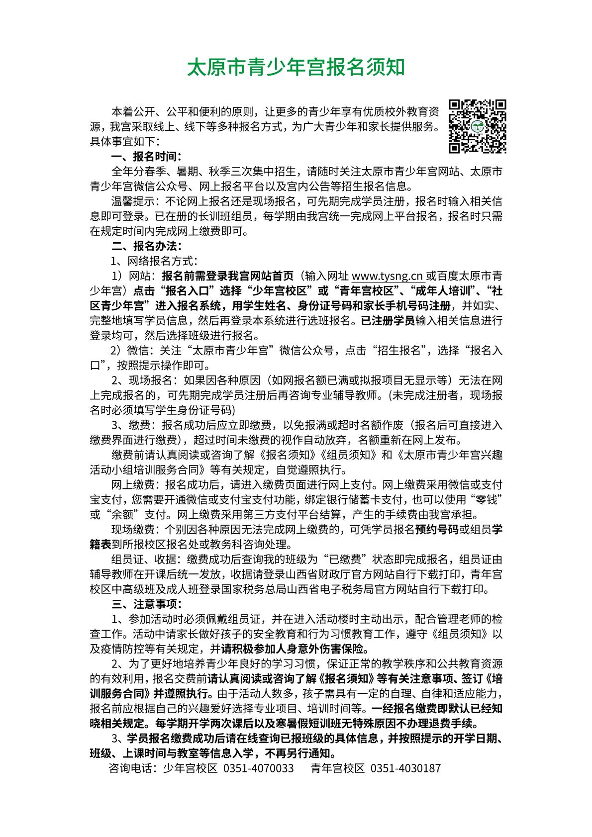 1、报名前请仔细查看招生计划,记清所报项目、上课时间、上课地点、教师等详细内容。缴费前请认真阅读或咨询了解《报名须知》《组员须知》和《太原市青少年宫兴趣活动小组培训服务合同》等有关规定,自觉遵照执行。学费不含活动中所需教材、耗材等费用,需自行负担。 2、开放网上自助报名的专业,2月26日9:00开始报名,家长自行在线操作即可。报名时通过我宫网站(www.tysng.cn)或微信公众号点击“报名入口”,选择“少年宫校区”或“青年宫校区”、“成年人培训”、“社区青少年宫”进行注册报名,并请即时缴费,否则过时名额作废。开课时间等信息点击“班级信息”查询,不另行通知。 3、插班报名咨询的家长请于3月6日后的兴趣小组活动正常活动时间上午9:30、下午15:30(夏季16:00)(即活动开始一小时)课间,进入相应楼层的活动室向辅导老师咨询。老师同意报名后,填写组员学籍表,自行在报名系统内注册孩子信息,到一层报名处办理手续。报名手续办理完毕,请家长及时在报名平台上“我的班级”中缴费即可,开课时间等事项具体咨询老师或在报名系统内点击“班级信息”查询。 4、由于活动人数多,孩子应具有较强的自理自律能力,请家长在报名前根据孩子兴趣谨慎选择,报名后不办理转班,否则不利于孩子的兴趣培养。 5、组员参加活动必须佩戴组员证,并在进入活动楼时主动出示,配合管理老师的检查工作。活动中请家长做好孩子的安全教育和行为习惯教育工作,保证遵守《组员须知》等有关规定,做好监护人的职责,并请积极参加人身意外伤害保险。 咨询电话:少年宫校区4070033 青年宫校区4030187