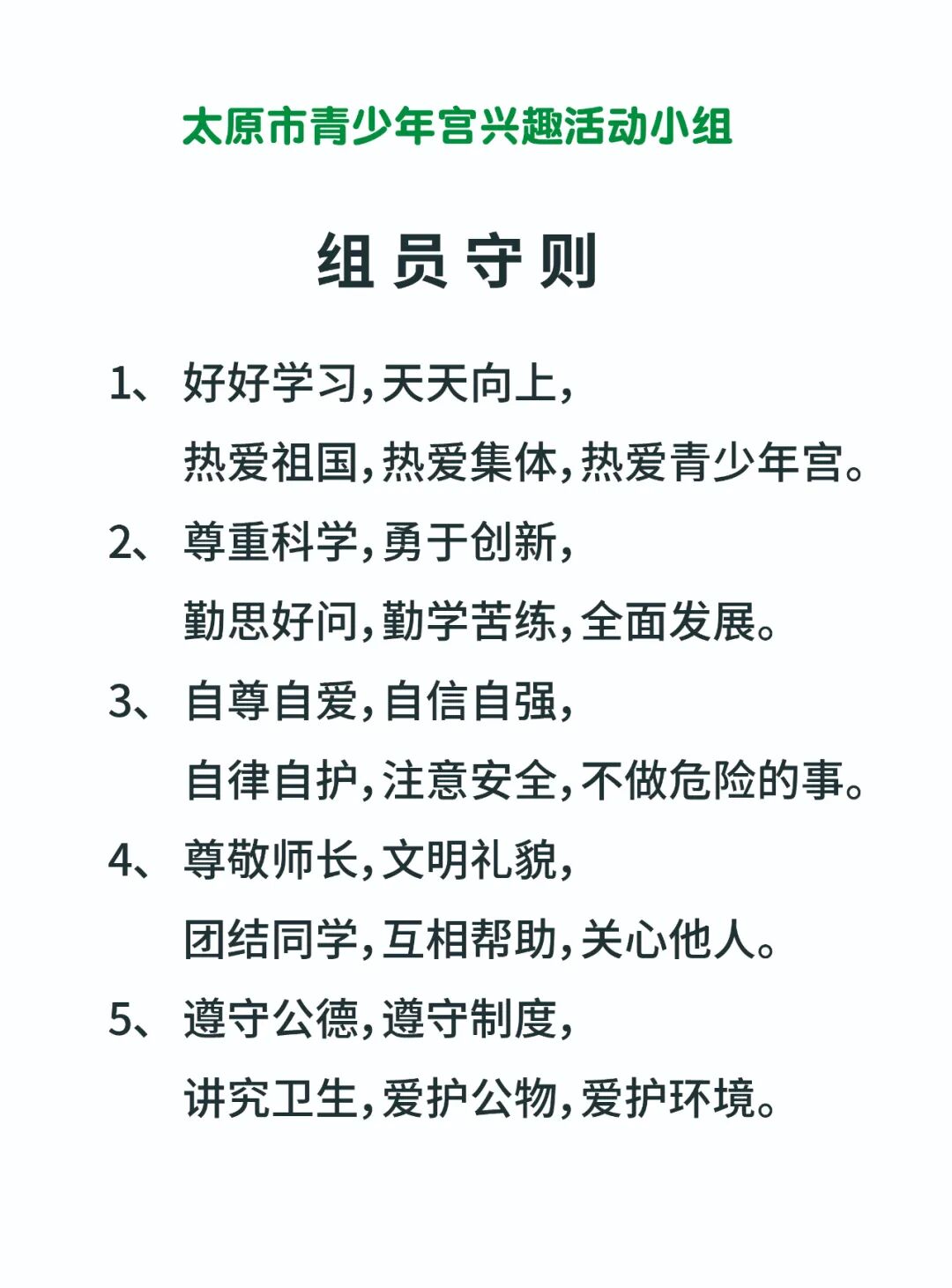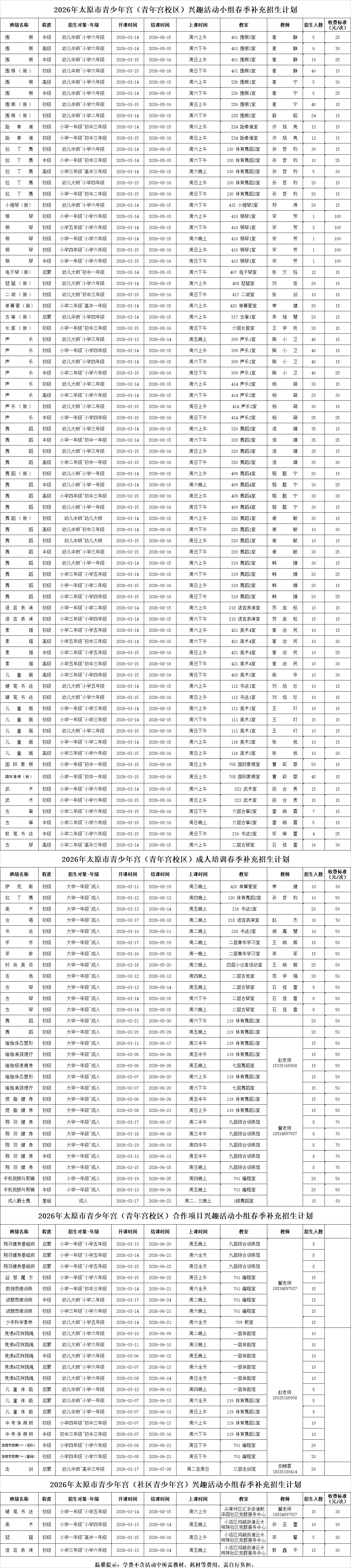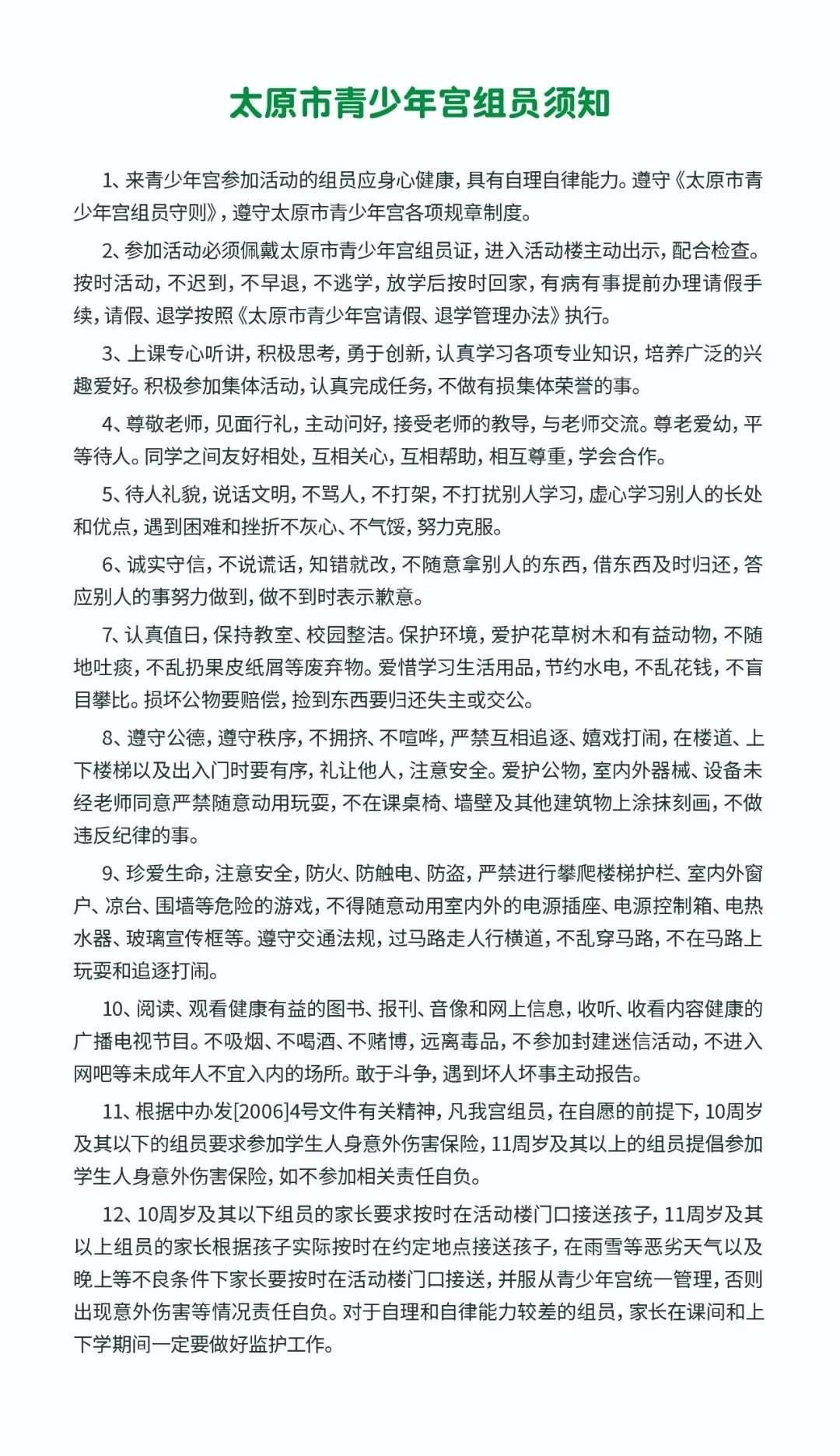 1、报名前请仔细查看招生计划,记清所报项目、上课时间、上课地点、教师等详细内容。缴费前请认真阅读或咨询了解《报名须知》《组员须知》和《太原市青少年宫兴趣活动小组培训服务合同》等有关规定,自觉遵照执行。学费不含活动中所需教材、耗材等费用,需自行负担。 2、开放网上自助报名的专业,2月26日9:00开始报名,家长自行在线操作即可。报名时通过我宫网站(www.tysng.cn)或微信公众号点击“报名入口”,选择“少年宫校区”或“青年宫校区”、“成年人培训”、“社区青少年宫”进行注册报名,并请即时缴费,否则过时名额作废。开课时间等信息点击“班级信息”查询,不另行通知。 3、插班报名咨询的家长请于3月6日后的兴趣小组活动正常活动时间上午9:30、下午15:30(夏季16:00)(即活动开始一小时)课间,进入相应楼层的活动室向辅导老师咨询。老师同意报名后,填写组员学籍表,自行在报名系统内注册孩子信息,到一层报名处办理手续。报名手续办理完毕,请家长及时在报名平台上“我的班级”中缴费即可,开课时间等事项具体咨询老师或在报名系统内点击“班级信息”查询。 4、由于活动人数多,孩子应具有较强的自理自律能力,请家长在报名前根据孩子兴趣谨慎选择,报名后不办理转班,否则不利于孩子的兴趣培养。 5、组员参加活动必须佩戴组员证,并在进入活动楼时主动出示,配合管理老师的检查工作。活动中请家长做好孩子的安全教育和行为习惯教育工作,保证遵守《组员须知》等有关规定,做好监护人的职责,并请积极参加人身意外伤害保险。 咨询电话:少年宫校区4070033 青年宫校区4030187